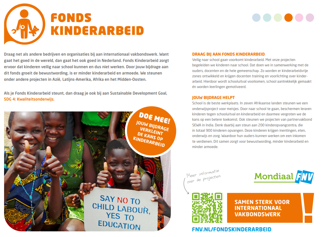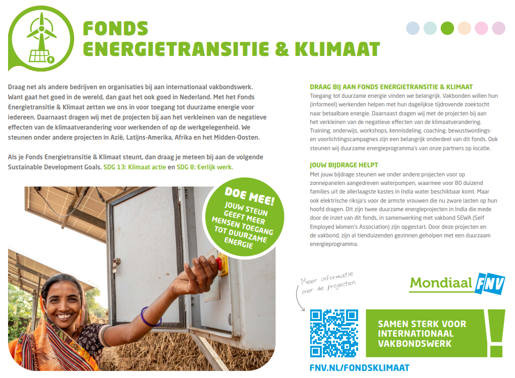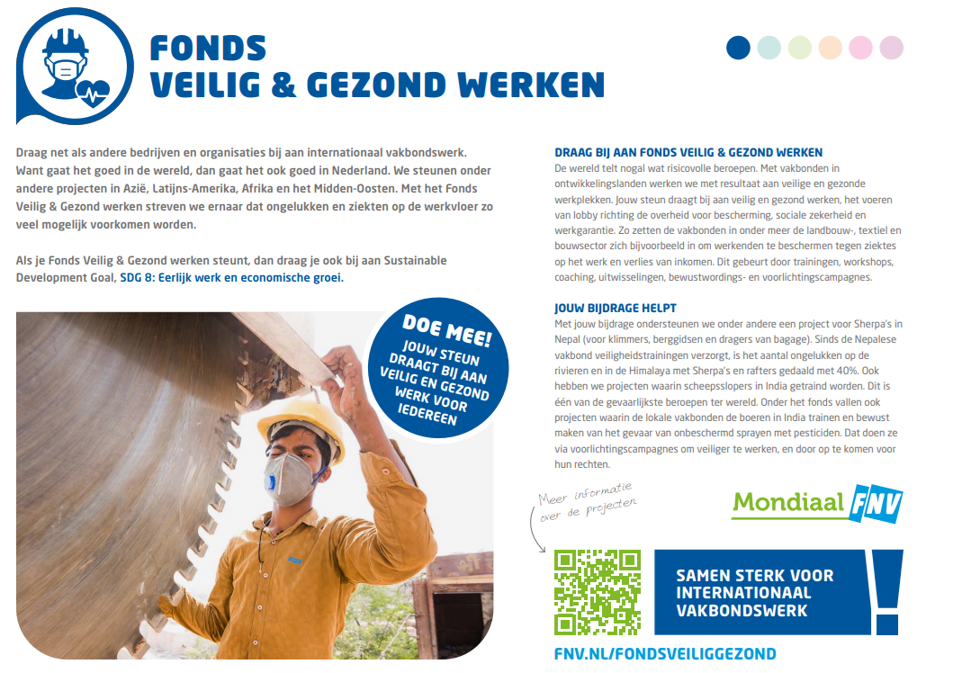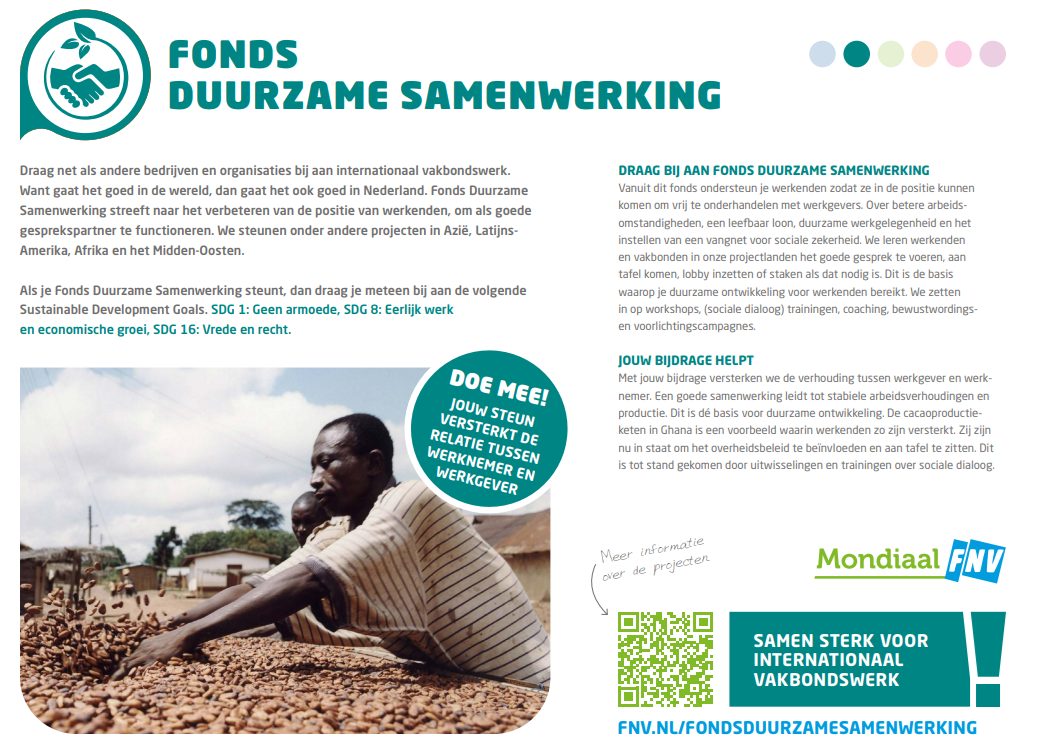 Een duurzame ontwikkeling voor werknemers bereik je door sociale dialoog en het aangaan van het gesprek. Het fonds Duurzame Samenwerking ondersteunt werknemers om met werkgevers te onderhandelen voor goede arbeidsomstandigheden, zoals een leefbaar loon en een veilige en gezonde werkplek. Met trainingen, kennisdeling en coaching leren we werknemers de juiste vaardigheden om voor zichzelf op te kunnen komen. Lees de flyer voor meer informatie.
