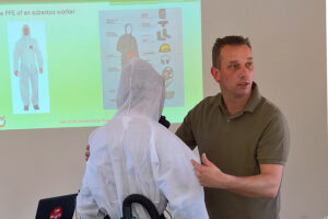 ‘Wij gaven eens training met een tolk die minder verstand had van de technische taal. Tijdens de koffiepauze zei een oud-cursist aanwezig: ‘Zal ik de vertaling doen? Want de tolk slaat de essentiële kennis over.’ Dat mocht natuurlijk. Die man vertelde steeds meer uit zichzelf. Uiteindelijk hoefde ik alleen nog maar de PowerPoint door te klikken. Hij had de les overgenomen. En dat is precies wat we wilden bereiken: kennis bijbrengen én overdragen. Het mooie is dat deze cursist later zelf trainingen heeft opgezet over hoe om te gaan met veiligheid.’