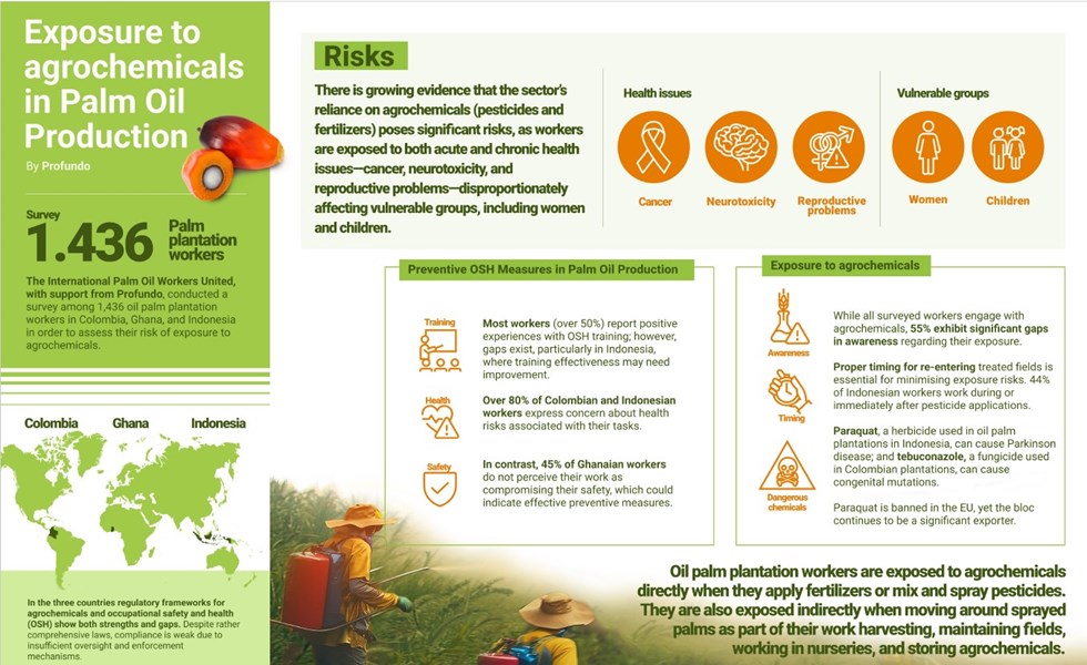 This report, commissioned by the International Palm Oil Workers United (IPOWU) with funding from Mondiaal FNV, sheds light on the significant health risks oil palm plantation workers face in Colombia, Ghana, and Indonesia due to exposure to hazardous agrochemicals. Despite the economic value of palm oil, its production frequently involves dangerous pesticides and fertilizers, putting workers at risk of severe health issues, including cancer, respiratory problems, and skin disorders, with added impact on vulnerable groups.